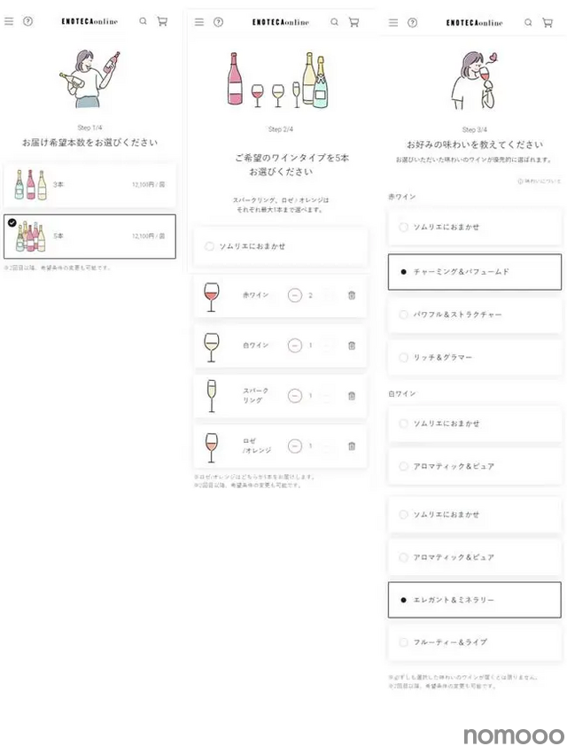 サービスでは、ワインの本数(3本または5本)やワインタイプ、味わいの好み、配送頻度を自由に設定できます。最初にワインタイプや味わいの好みを登録すると、お客様の嗜好に合うワインが届く仕組みです。季節に合わせたおすすめのワインを配送する「ソムリエにおまかせ」を選択することも可能です。