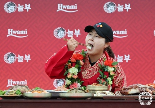 KLPGA(韓国女子プロゴルフ協会)ツアーで珍しい光景が繰り広げられた。優勝者が記者たちの前で豪華なご馳走を食べるという優勝セレモニーだ。