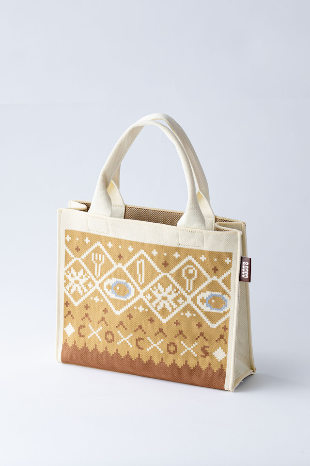 ニットバッグは包み焼きハンバーグやナイフ、スプーン、フォークといったココスらしい商品をデザインに取り入れた冬にぴったりのノルディック柄。500ミリリットルペットボトルや折り畳み傘も入る使いやすいサイズで、生地に厚みがあり、マチがあるため自立する。