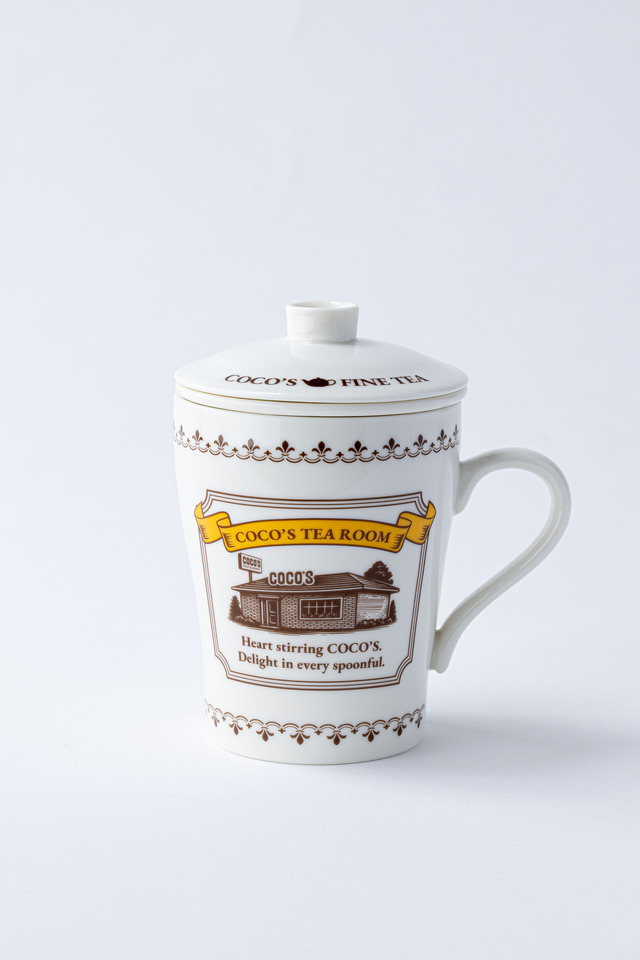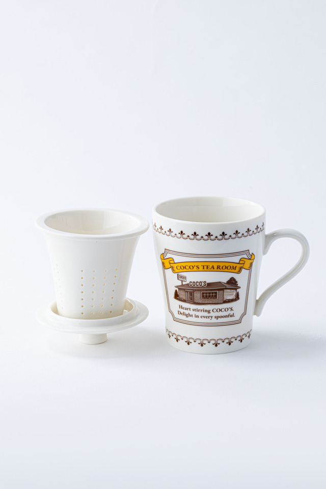 茶こし付きマグカップはココスの店舗が英国風のイラストで描かれた陶磁器製。容量は380ミリリットルで、茶こしは取り外し可能なため手入れも簡単だ。