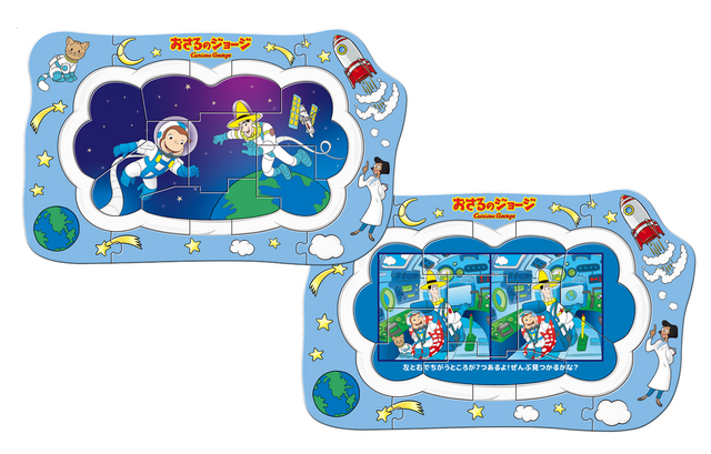 パズルは、ピースの形の違いを見比べて、部分と全体を考える遊び。パズルの裏面のめいろは、行き止まりにぶつからないように、ゴールへ至る道を選んでいく論理性を養う。さらに、おもちゃをスマートフォンで読み込むと、自分の顔を動かして遊ぶオリジナルゲーム「ワクワクりんごキャッチ!」と「すすめ!ばくそくロケット」が楽しめる。