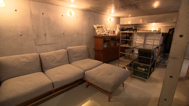 地下は14.5帖ある家の中で一番広い部屋。収納とスクリーンを備えたリビングになっている。この地下室を作るため1階部分を約1メートル底上げ。土を掘る量を通常より減らすことで、コストダウンと広いスペースを実現した。
