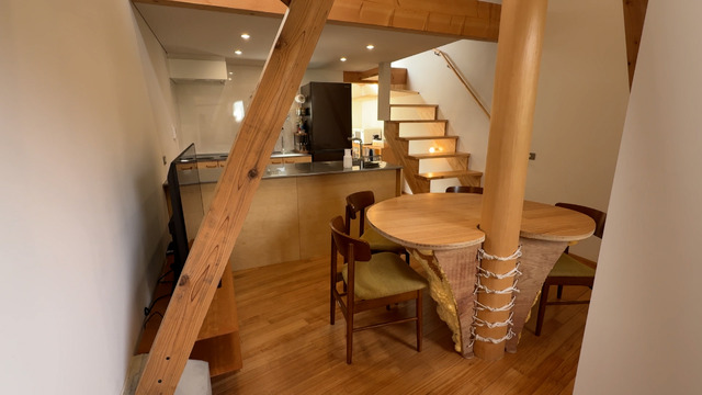 家の中は明るい印象だが、中央に大きな柱が立っている。実は、外側の壁が複雑な形をしているため、構造上必要な柱を埋め込むことができず、外観を優先した結果、柱が部屋の真ん中を通ることになったという。柱を取り囲んだダイニングテーブルは夫がDIYしたもの。脚がなく、発泡ウレタンという断熱材を吹き付けて補強している。白い泡がモコモコしたような斬新な形状はまさに“キモカワ”だが、テーブルに脚がないおかげで狭小でも窮屈ではないそう。