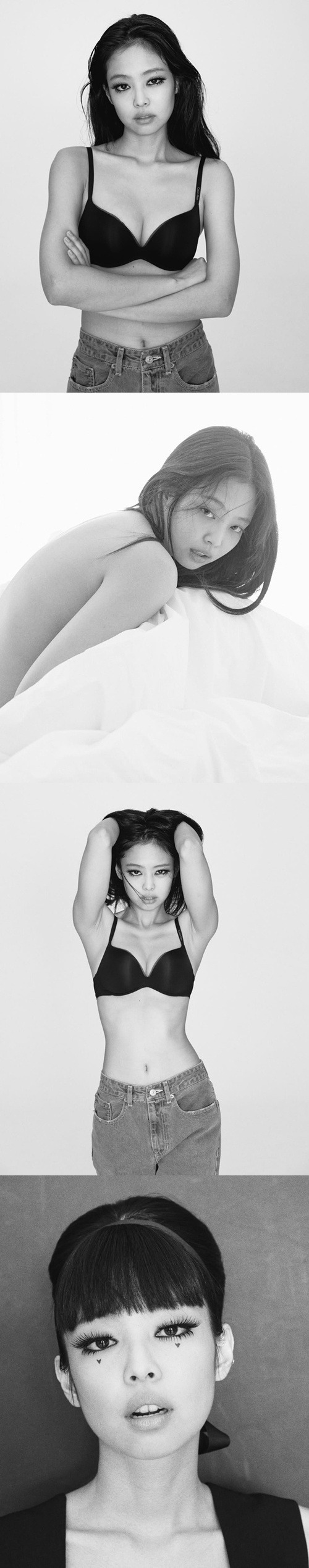 公開されたモノクロ写真の中でジェニーは、カルバン・クラインのアンダーウェアのみを身に着け、ベッドの上で幻想的な眼差しを放ったり、思い切って背中を露わにし、妖艶な雰囲気を醸し出したりしている。