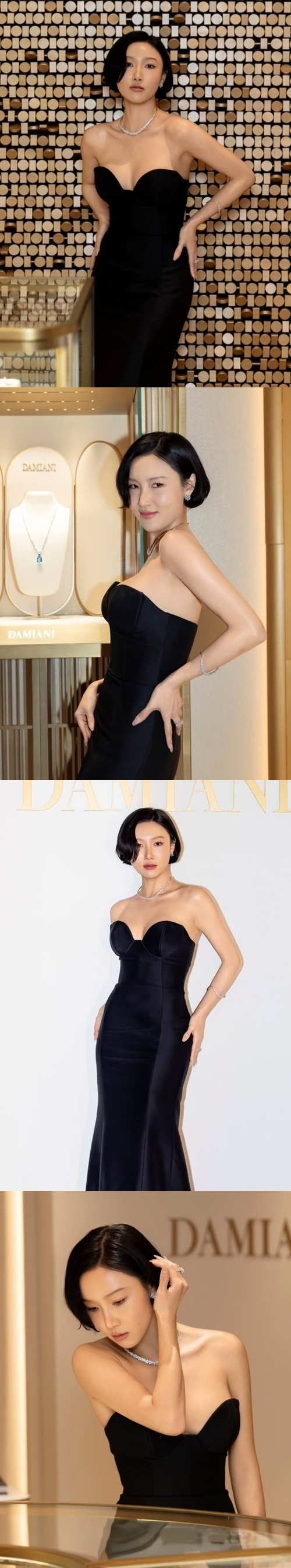 さらに、華やかなダイヤモンドのネックレスやイヤリングなどのハイジュエリーを合わせ、官能的でありながらも気品ある雰囲気を完成させた。