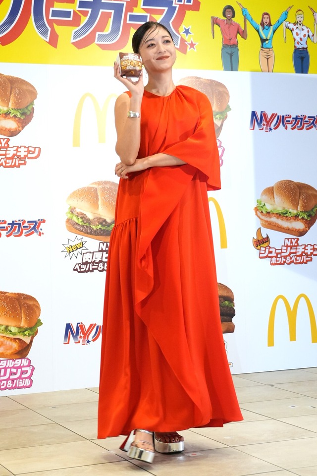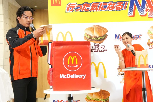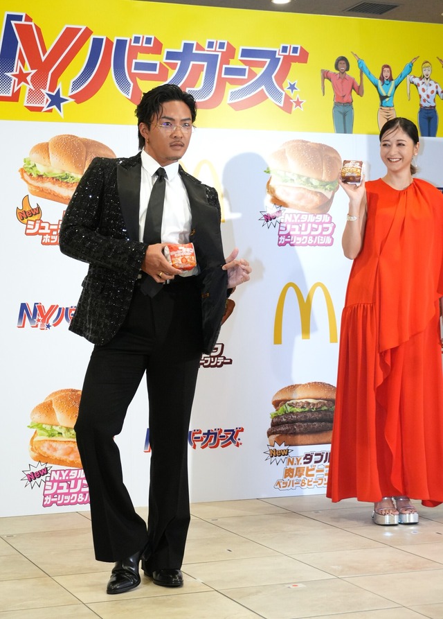 3人はマクドナルドの新商品「N.Y. バーガーズ」にちなみ、“ニューヨーク”をイメージした衣装を着用し、ファッションショー形式で登場。