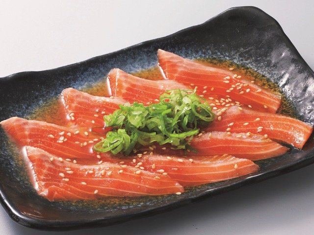 新メニュー「レバ刺しみたいなサーモン」は759円で、鮮度抜群のサーモンを香ばしいごま油、塩とねぎで味わう一品だ。まるでレバ刺しのような濃厚で芳醇な美味しさを楽しめる。