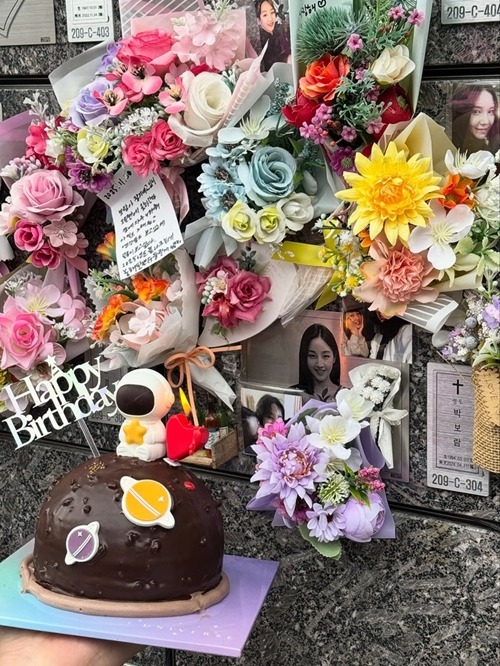 公開された写真には、ジャイアント・ピンクやヘリンら親しい知人たちが、パク・ボラムさんが眠る納骨堂を訪れ、バースデーケーキを供えて追悼する姿が収められている。特に、彼女たちが用意した「宇宙船の形をしたチョコレートケーキ」と、その上に立てられた「Happy Birthday」のメッセージが目を引いた。