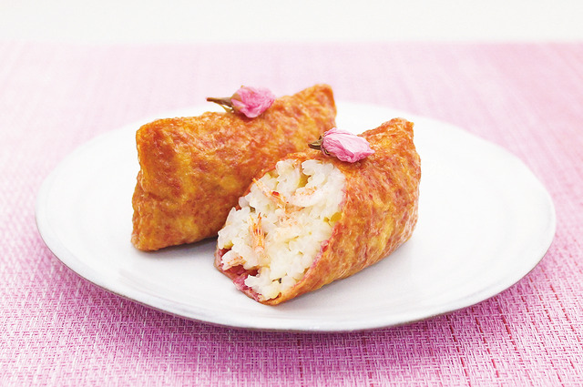 地下2階「いなり寿し専門店 豆狸」では、桜えび、しいたけ、かんぴょうを混ぜた酢飯をピンクのおあげで包み、桜の花をのせた「桜いなり」270円を販売する。