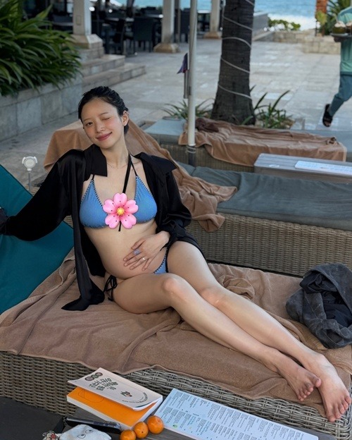 最近、自身のSNSに「ニャチャン Day1-2」と綴り、数枚の写真を投稿した。青い海を背景にゆったりと過ごす姿が収められており、中でも青いビキニを着用して臨月のお腹(Dライン)を堂々と披露したカットが注目を集めている。