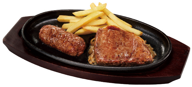 「ブロンコおじさんのこだわり炭焼きがんこハンバーグ&炭焼き極選プレミアムサーロインステーキ」単品価格:300g 3,280円(税込3,608円) (ハンバーグ150g+ステーキ150g)