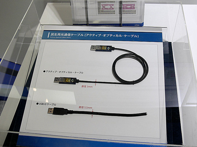 TDKブースに展示されている民生用光通信ケーブルのモックアップ。USBケーブルのコネクタ内にO/E変換モジュールが組み込まれている