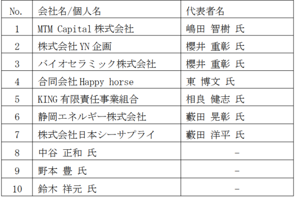 本勧告書において、当社独立委員会は、MTM Capital株式会社、株式会社YN企画、バイオセラミック株式会社、合同会社Happy horse、KING有限責任事業組合、静岡エネルギー株式会社、株式会社日本シーサプライ、中谷正和氏、野本豊氏及び鈴木祥元氏(以下「本認定対象株主」といいます。)の間において、当社株式に関して共同協調行為に該当する行為を行っていると認められる旨勧告しております。