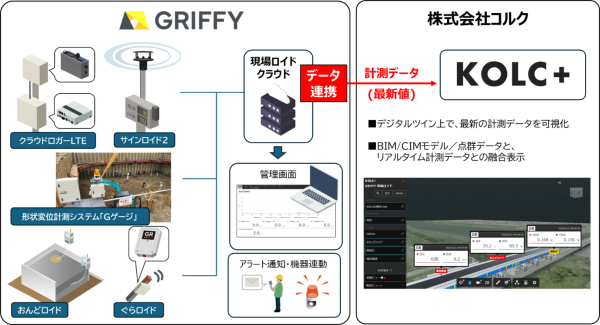 上記サービスで計測されたデータはクラウドに送信され、グラフ表示やアラートメール通知などが可能になっています。今回、データ連携機能の実装により、「KOLC+」で構築したデジタルツイン上で、現場ロイドクラウドの最新の計測データを可視化できるようになりました。BIM/CIMの3次元データと、リアルタイム計測データを融合して表示することが可能となることで、俯瞰的なデータ把握を通じて品質管理や安全管理を効果的に行うことが期待できます。