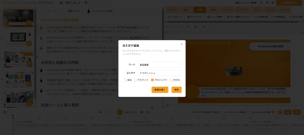 一方、動画制作の現場では「発音指定のためのタグや辞書ファイルを別で管理する」よりも、「動画編集画面の中で、読みだけを必要な分だけ登録して、以後は自動で揃う」ほうが手戻りを減らしやすい場面が多くあります。WriteVideoはこの制作フローに合わせ、プロジェクト内から読みを登録・管理できる“読み仮名辞書”として提供します。
