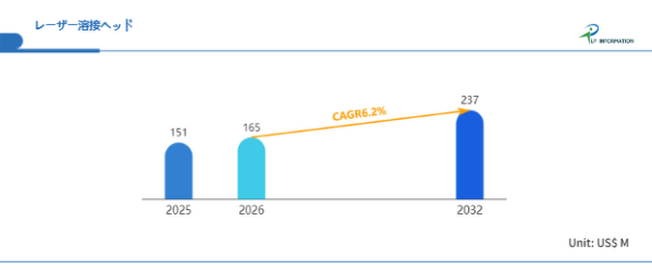 LP Informationの最新レポート「世界レーザー溶接ヘッド市場の成長予測2026~2032」(https://www.lpinformation.jp/reports/638053/laser-welding-head)によれば、2026年から2032年の予測期間中、グローバルレーザー溶接ヘッド市場はCAGR6.2%で順調に拡大し、2032年には2.37億米ドルに達すると予測されている。