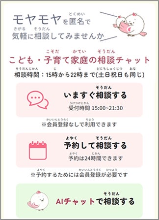 子供や子育てに関する日常的な不安や悩みについて、無料でチャット相談ができます。