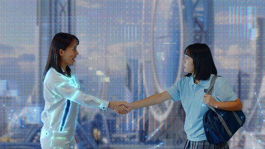 15歳の主人公が時を超え、2050年の建設の世界へ何気なく窓の外を眺めながら「未来」について考える15歳の少女。突然、そばにあった壁面ビジョンに映る“女性”に声を掛けられ、画面に映る2050年の世界に引き込まれます。なんとその“女性”は、建設業で働く“未来の自分”だったのです。