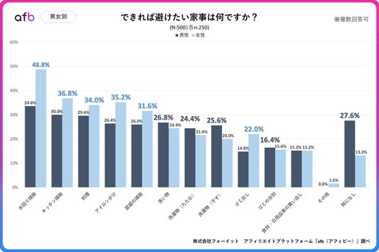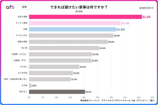 アフィリエイトプラットフォーム「afb(アフィビー)」< https://www.afi-b.com/ >の開発運用をおこなう株式会社フォーイットは、全国の20代~60代までの男女500人を対象に家事に関するアンケートを実施し、年代別等の特徴についてまとめました。