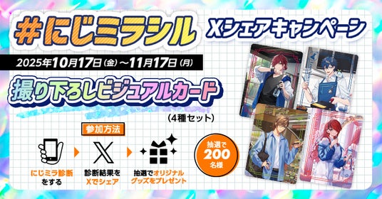 「にじミラ診断」の結果をX(旧Twitter)に投稿すると、抽選で200名様に「撮り下ろしビジュアルカード(4種セット)」が当たります。カードは今回だけのホログラム仕様となっており、ここでしか手に入らない特別なアイテムです。