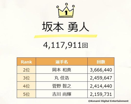 さらに、この10年間で蓄積されたゲーム内の統計データを「プロスピA プレイデータ」として、特設サイトに初めて公開しました。ユーザー数はこの10年で約4.95倍に上昇し、リアルタイム対戦(オンライン対戦)の総試合数は26億8700万回(※)を記録し、プロ野球の約300万年分もの試合がプレーされていました。このほかにも、最も能力値が上昇した野手や投手、ユーザーに最もスカウトで獲得された選手など、さまざまなデータを特設サイトで確認できます。