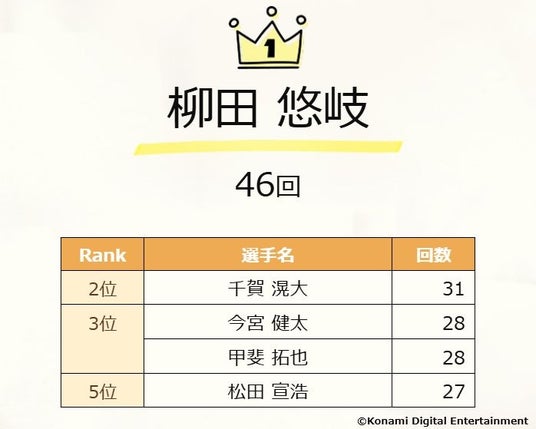 スカウトでSランクとして実装され、ユーザーから最も獲得された選手を12球団別にランキング。第一線で長く活躍する選手が名を連ね、リアルタイム対戦でも採用率が高い選手がランクインしています。