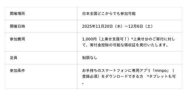 ◇チャリティーウォーク専用アプリ「minpo」を活用したイベントです。参加費をお支払いいただくと参加メンバーになり、歩数がカウントされる仕組みなので、歩く場所、時間はすべて自由。どこから参加しても、全参加者の歩数ランキングを確認することができます。