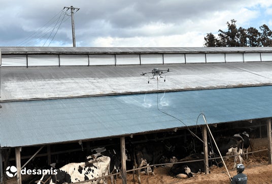 デザミス株式会社(本社:東京都江東区、代表取締役:清家浩二、以下「デザミス」)と宮城県酪農農業協同組合(本所:宮城県仙台市青葉区、代表理事組合長:上野栄公、以下「宮城県酪」)は、酪農現場における暑熱ストレスの軽減と生乳生産量の安定化を目的とした、ドローン施工※による「酪農施設暑熱対策緊急実証事業(以下「本事業」)」のモデル施工を行いました。