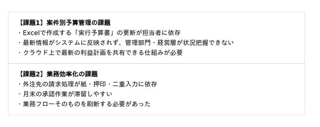 長年活用してきたスクラッチシステムからのリプレイスにより、案件別予算管理の精緻化・リアルタイム化、ならびに業務プロセス全体の効率化を図ります。