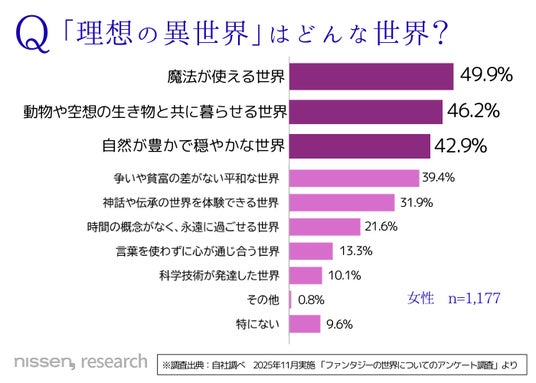 ・理想の「異世界」像については、1位「魔法が使える世界」(50%)、2位「動物や空想の