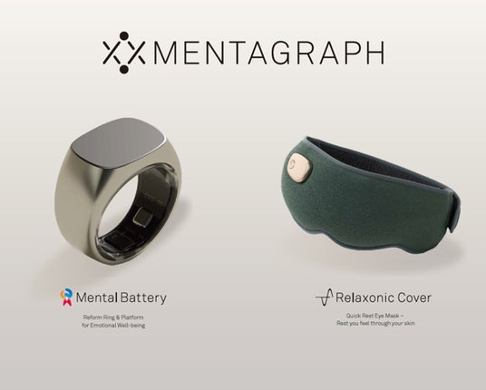 MENTAGRAPHは、日本たばこ産業(JT)のコーzポレートR&D組織「D-LAB」から誕生し、心に向き合う文化を育み、一人ひとりのウェルビーイングを支えるサービスを提供しています。主力プロダクトは、スマートリング「Mentoring」、アプリによる心の疲労度の可視化および休憩をレコメンドする「Mental Battery」サービスです。また、超高周波「ハイパーソニック」と温熱機能で短時間での深い休息をサポートするスピード休息アイマスク「Relaxonic Cover(リラソニックカバー)」も展開しています 。