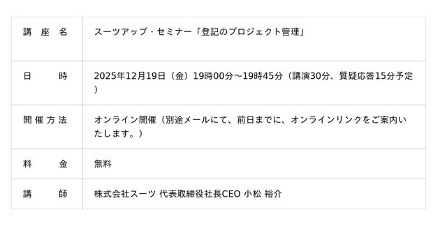 当社では、2025年12月19日(金)19時から、当社代表の小松が講師を務めるスーツアップ・セミナー「登記のプロジェクト管理」を無料開催します。