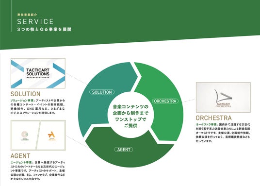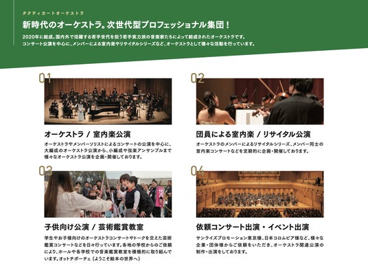 企業や自治体、イベント主催者からの出演・演奏依頼は、従来通りタクティカートが窓口となり、企画立案から条件整理、キャスティング、制作進行までを一貫して担います。