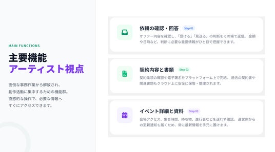 従来のコンサート・イベント制作現場では、出演依頼はメール、契約書は紙やPDF、スケジュール管理は別のツール、報酬処理は経理部門と、情報が分散し、コミュニケーションロスや事務作業の負担が課題となっていました。