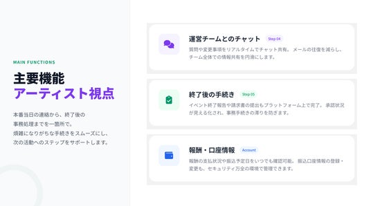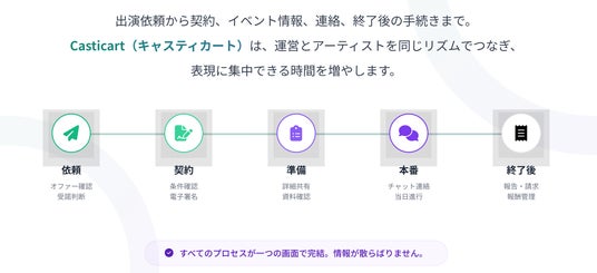 イベント制作やアーティストマネジメントにおける煩雑な業務フローを一元化する「Casticart(キャスティカート)」が正式リリースされました。本プラットフォームは、出演依頼から契約締結、イベント情報の共有、当日までのコミュニケーション、終演後の謝礼お支払いまで、コンサート・イベント制作に関わるすべてのプロセスをデジタル化し、運営者とアーティスト双方の業務効率を大幅に向上させます。