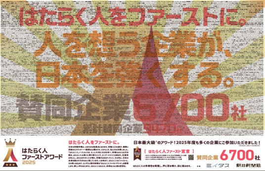 株式会社朝日新聞社(代表取締役社長CEO:角田克)が、ミイダス株式会社(代表取締役社長:後藤喜悦)と開催している「はたらく人ファーストアワード2025」(主催:ミイダス・朝日新聞社)において、「はたらく人ファースト宣言」に6,700社が賛同しました。従業員一人ひとりを大切にしている企業を称え、その取り組みを発信することで、「はたらく人ファースト」な社会づくりを推進しようという取り組みで、アワードに応募いただいた企業の中から、「はたらく人ファースト」の理念を体現する企業を表彰します。今年3月4日(水)に授賞式を開催する予定です。