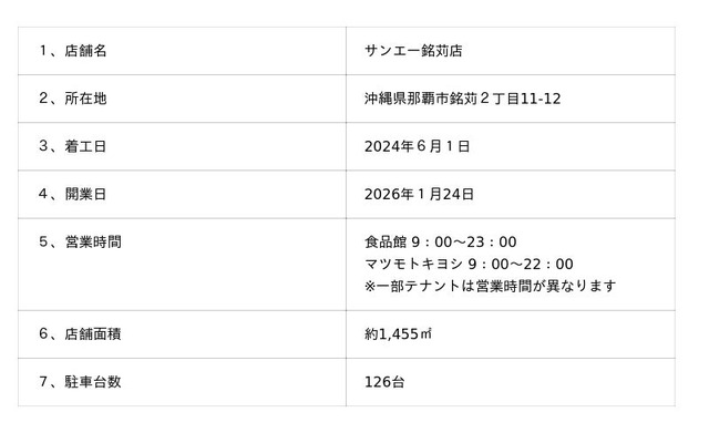 株式会社サンエー(本社:沖縄県宜野湾市、代表取締役社長:豊田沢)は、2026年1月24日、那覇市銘苅に「サンエー銘苅店」をオープンいたします。 銘苅エリアは、人口増加が続く那覇新都心にあり、当店は住宅地や学校が徒歩圏内にあるなど、利便性に優れた立地となっております。