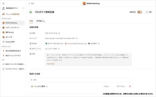 多くの企業において、「会議の生産性」と「会議で生まれた知見の組織内活用」は共通の課題となっています。こうした背景から、当社は「会議そのものの在り方」を再設計する機能として「MANA Meeting」を開発しました。「MANA Meeting」はリリース後も継続的に進化します。今後は、会議の前後で生まれる情報を業務の実行につなげられるよう、連携範囲の拡充や支援機能の強化を進めていきます。