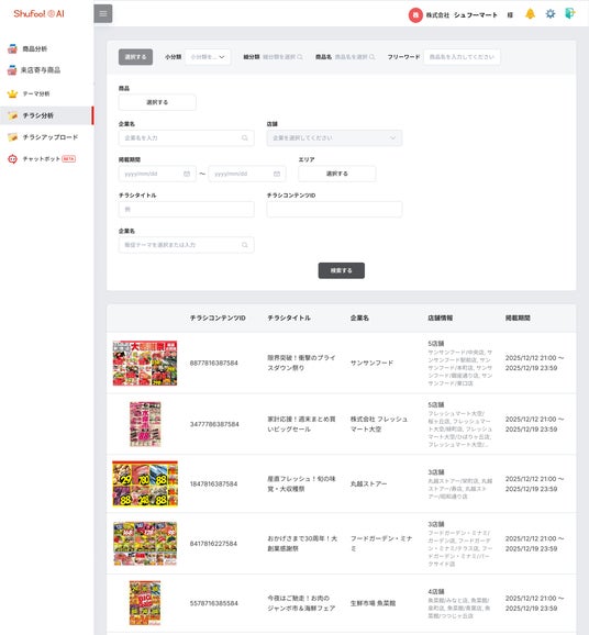 チラシ分析の新機能です。任意のテーマやキーワードを入力することで、該当するチラシ画像を一覧表示し、これまで市場でどのような訴求が行われてきたのかを視覚的に把握することができます。