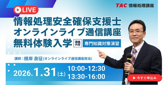 情報処理技術者試験対策講座を展開しているTAC株式会社(東京都千代田区、代表取締役:多田敏男)は、2026年春期合格目標のオンラインライブ通信講座の無料体験入学を1/31(土)に開催します。