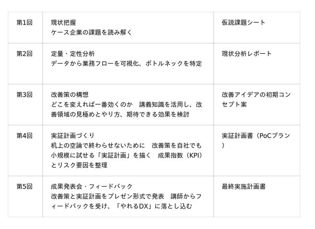 グループワークを通じて、実際の事例を題材にDX施策と実行計画を策定。自社と重ね合わせて検討できる内容を予定しています。全5回のワークを通してひとつの課題に取り組みます。最後の第5回目には成果発表会を行い、講師からのフィードバックでより実践的な力を身につけます。