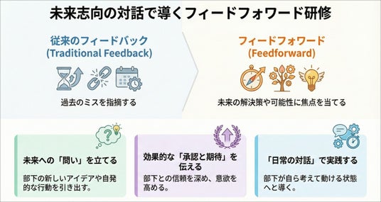 本研修は、未来志向の対話を習得し、部下の主体的な行動と成長を促すフィードフォワードの実践力を養うことを狙いとしています。