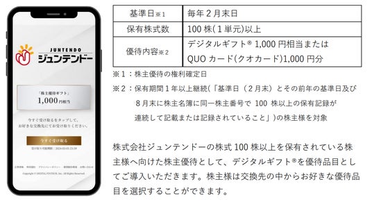 株式会社ジュンテンドー(代表取締役社長:飯塚 正、東証スタンダード:証券コード9835)において、株式会社デジタルプラス(代表取締役社長:菊池 誠晃、本社:東京都渋谷区、東証グロース市場:証券コード3691)グループが運営する「デジタルギフト(R)」を株主優待としてご活用いただくことになりました。