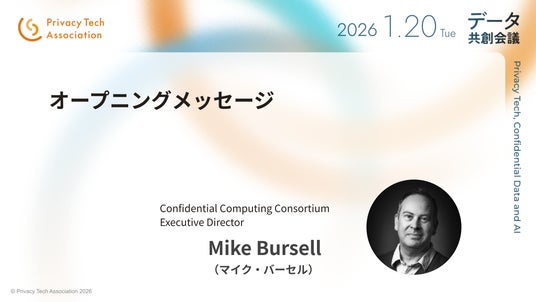 秘密計算の技術の普及を目指すグローバル団体 Confidential Computing Consortium Executive Director Mike Bursell(マイク・バーセル)氏、東京大学大学院情報学環・教授 越塚 登 氏がオンラインで登壇。本カンファレンスのテーマである「データ共創」に向けたメッセージをいただきます。