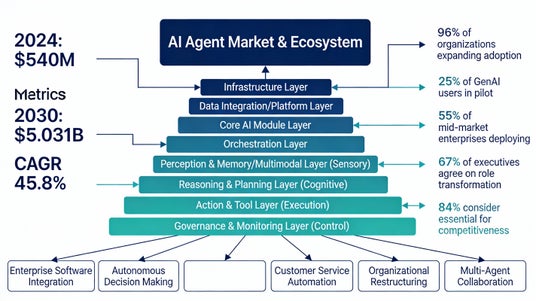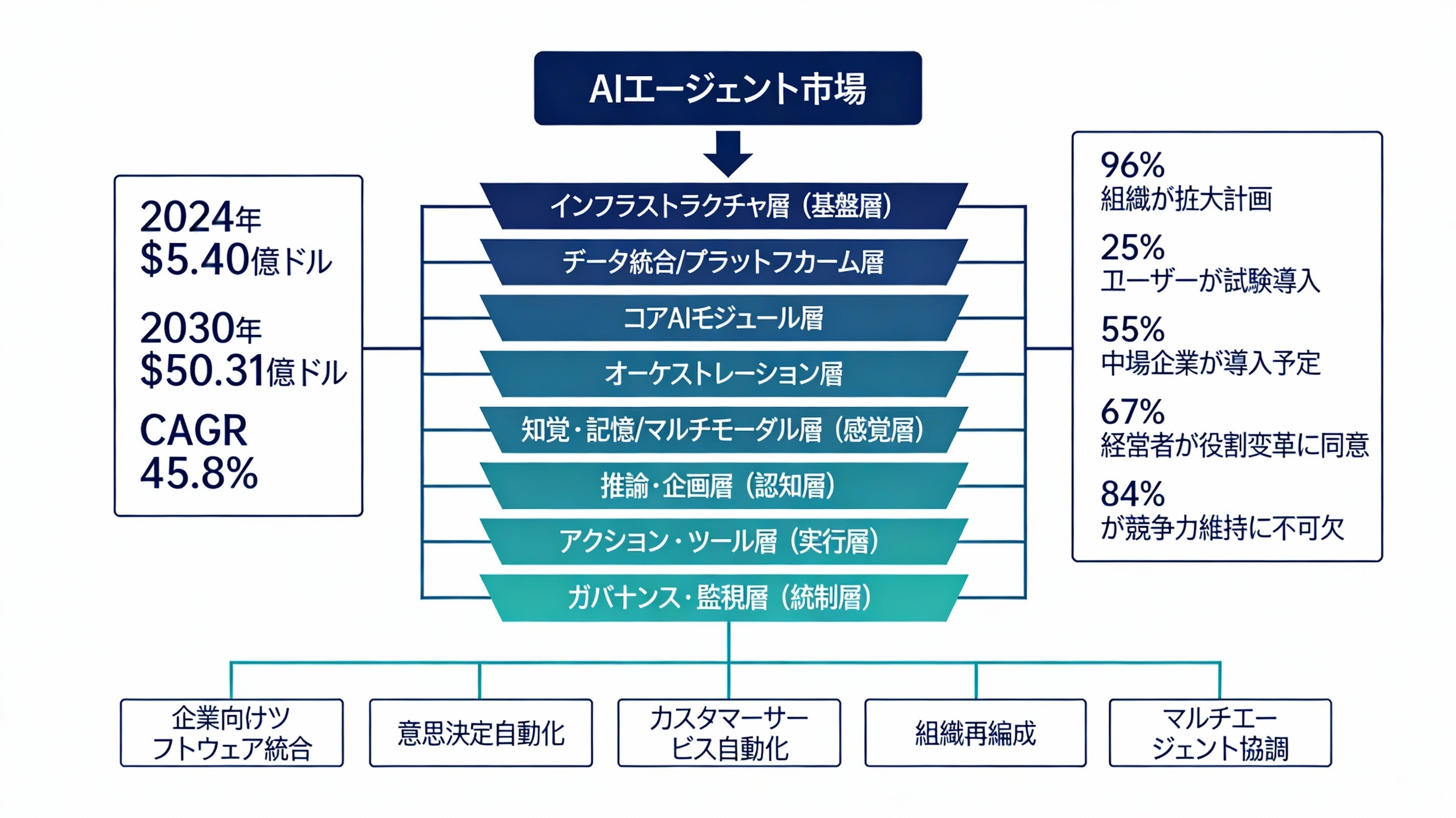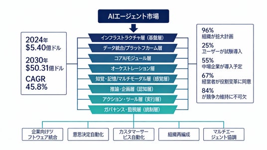 AIエージェント市場は急速に成熟段階へ移行しており、2024年の5.40億ドルから2030年には50.31億ドルへと9倍以上の拡大が見込まれている。同時に、導入企業の組織変革の必要性が急速に高まっている。