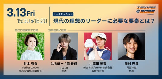 Forbes JAPAN web編集長の谷本氏をファシリテーターに迎え、令和時代において理想とされるリーダー像や、これからの社会で求められる資質について議論します。価値観や働き方が大きく変化する中で、リーダーは何を指針に意思決定を行い、どのように人や社会と向き合うべきなのかを掘り下げていきます。登壇者は、ショートドラマ業界注目のZ世代起業家、“はるぼー”こと株式会社HA-LU 代表取締役社長の岡 春翔氏、おにぎり屋「ONI&Co. Tokyo Lab.」を拠点に、日本のおにぎり文化を世界へ発信することに挑む起業家、Rice Platformer 株式会社 取締役社長の川原田 美雪氏、政党「再生の道」代表の奥村 光貴氏です。エンターテインメント、食、政治といった異なる分野で挑戦を続ける多様なリーダーが集結し、それぞれの立場からリアルな経験や価値観を語ります。
