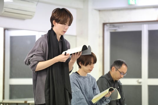 稽古は原作の世界観を忠実に再現しつつ進むが、明確な違いを感じたのはやはり「声」の迫力。稽古はちょうどリョウが富江との間に起きた過去を保子に話し、今後の協力を頼むシーン。高塚は抑えていた感情が高まり、思わず声を荒げてしまうリョウを生々しく表現。それを受けて声を震わせる高森の保子役もリアルで、セリフの合間の息遣いからもふたりの緊迫した様子が伝わってくる。その後の保子とアヤカ(富江)のやりとりでも、絶世の美少女を現実のものとして立ち上がらせているのは、佐倉の「声」ゆえだ。まろやかで蠱惑的な、いつまでも聞いていたくなるようなその声で保子やリョウを罵倒する佇まいは“富江”そのもの。そこに怪談師としても活躍する村上の語りが入ることで、さらに恐怖感が増していく。演出の烏丸棗にセリフのタイミングを細かく確認していく演者たちの姿も印象に残った。