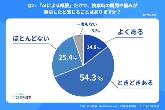この結果から、「AIによる概要」は検索課題を“毎回完全に解決する存在”というよりも、状況次第で役立つ情報源として認識されているといえるでしょう。