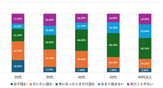 また、これを年齢別に見ると、若年層ほど「必ず読む」「だいたい読む」の割合が高く、20代では合わせて52.7%が積極的に活用していました。