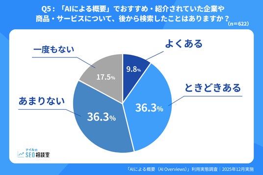 「AIによる概要」でおすすめ・紹介されていた企業や商品、サービスについて、後から指名検索などをした経験があるユーザーは、「よくある」(9.8%)、「ときどきある」(36.3%)を合わせて半数弱にとどまりました。